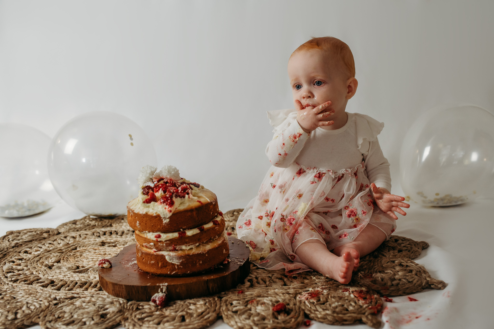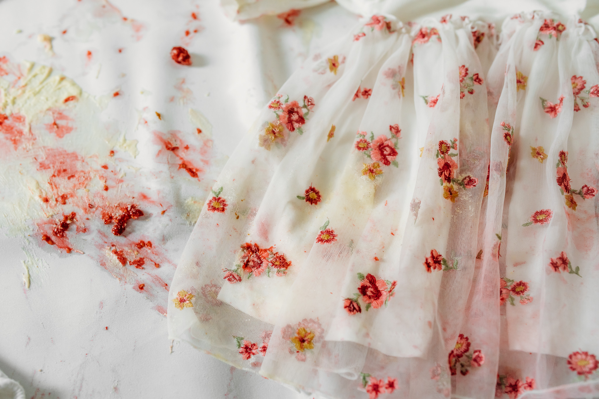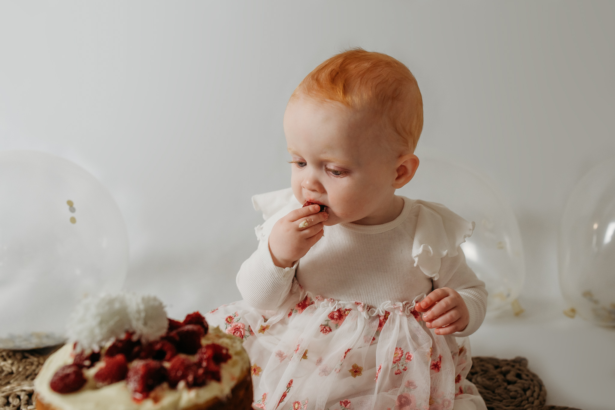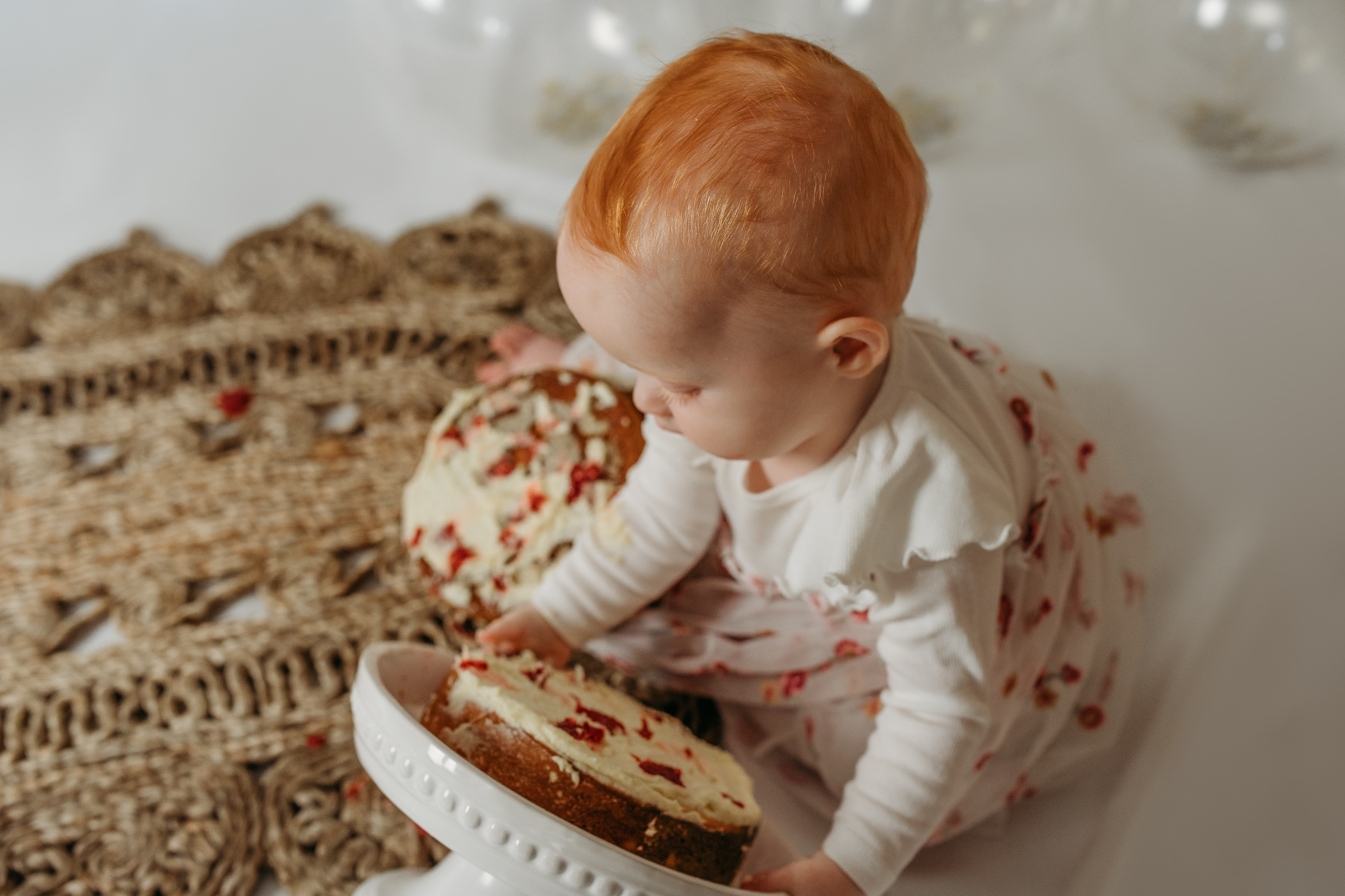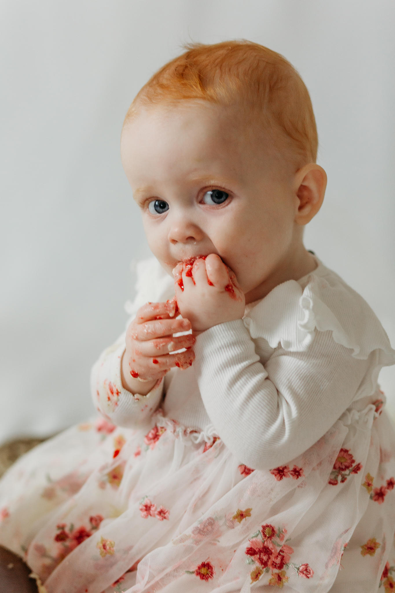Liliana wasn’t that into smashing the cake. She mostly gently picked off the berries and pulled a few faces from their tartness. While she never ended up smashing into the cake, she did pull it over and still managed to get plenty messy. I really wanted to just capture her cake smash experience honestly, so rather than trying to get her to make a huge mess, I just sat back and let her explore the cake how she felt comfortable.