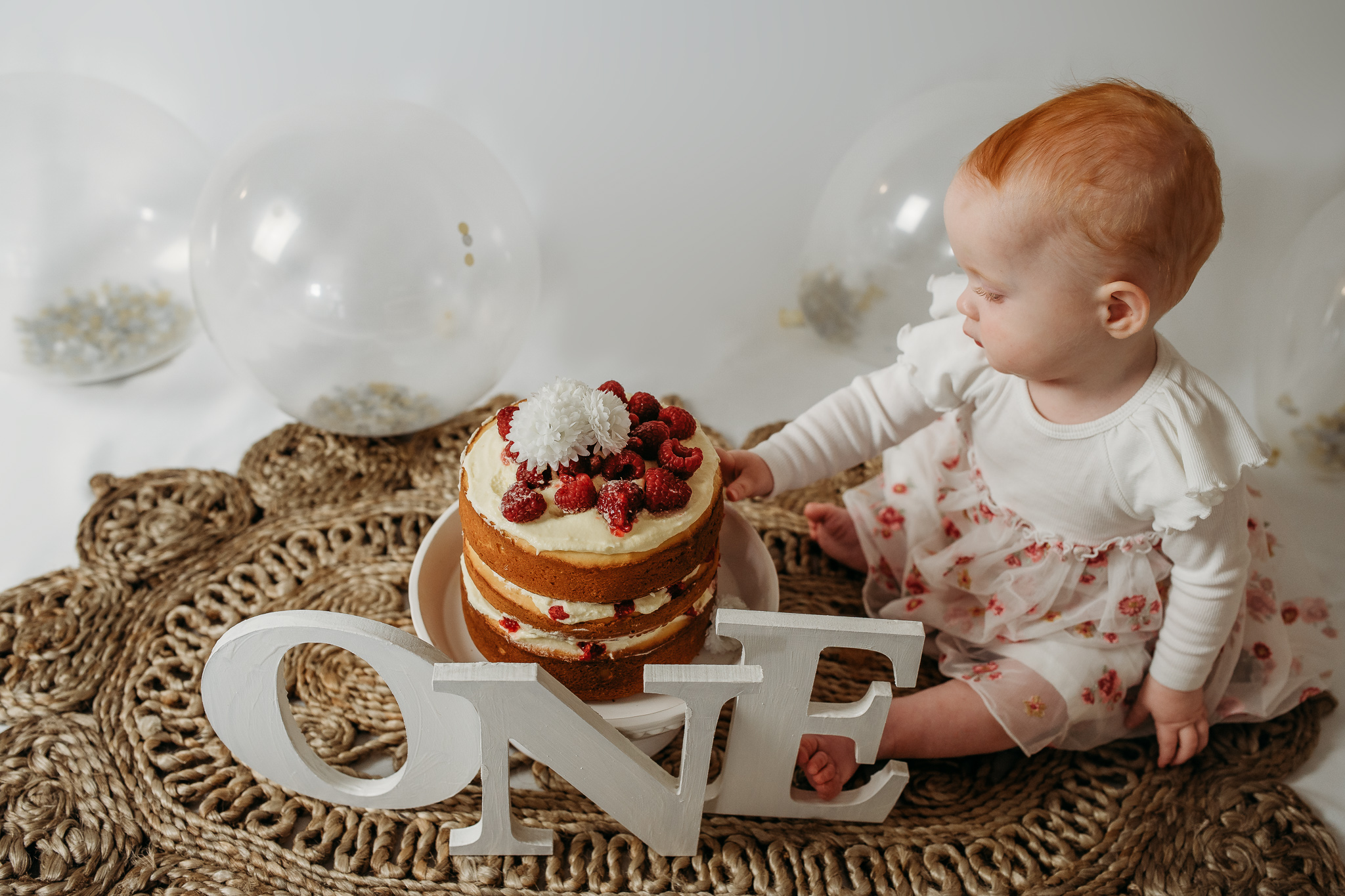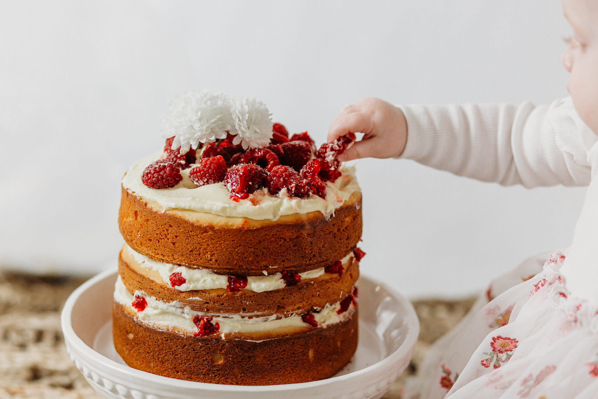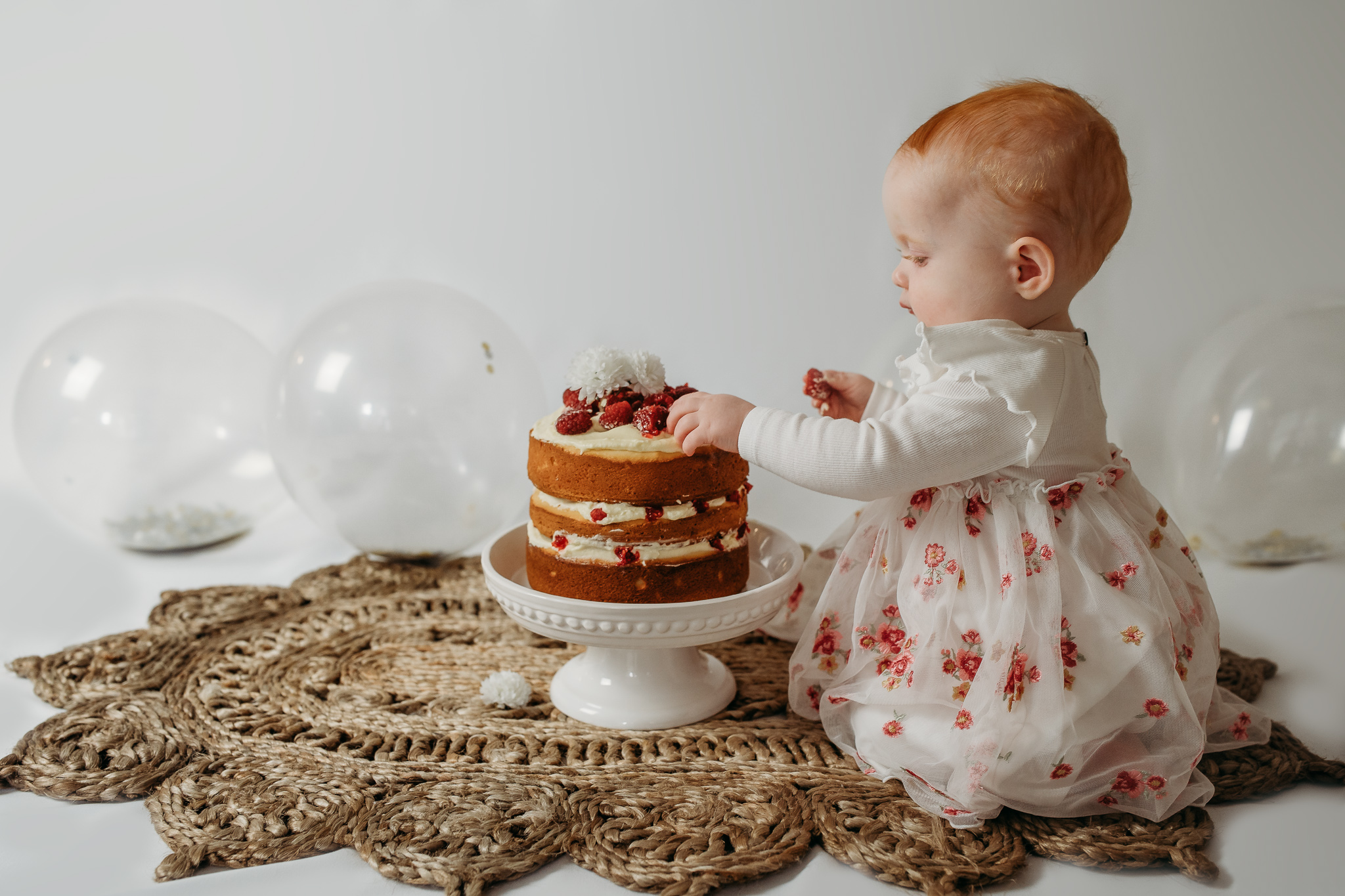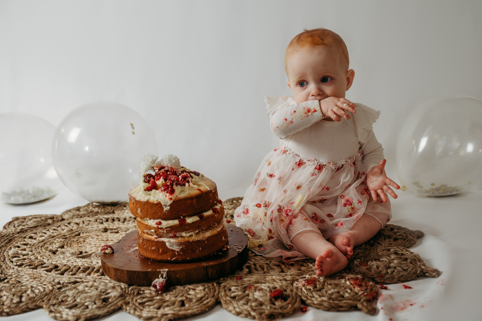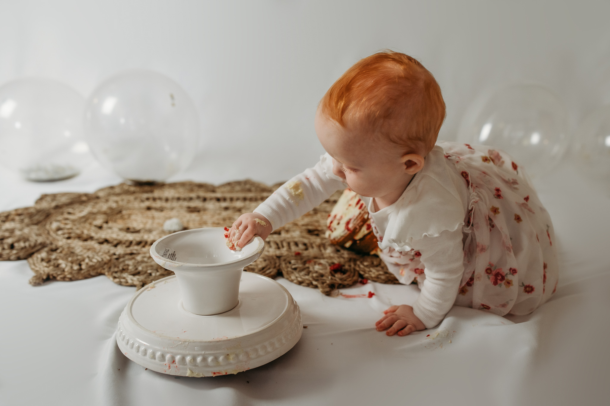 Liliana wasn’t that into smashing the cake. She mostly gently picked off the berries and pulled a few faces from their tartness. While she never ended up smashing into the cake, she did pull it over and still managed to get plenty messy. I really wanted to just capture her cake smash experience honestly, so rather than trying to get her to make a huge mess, I just sat back and let her explore the cake how she felt comfortable.