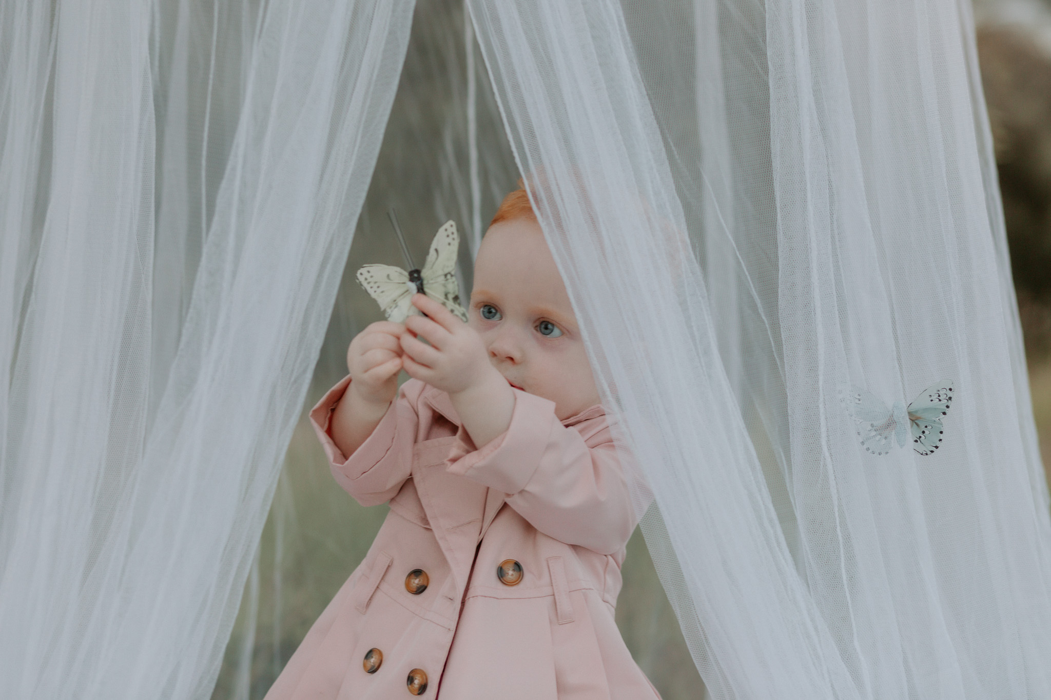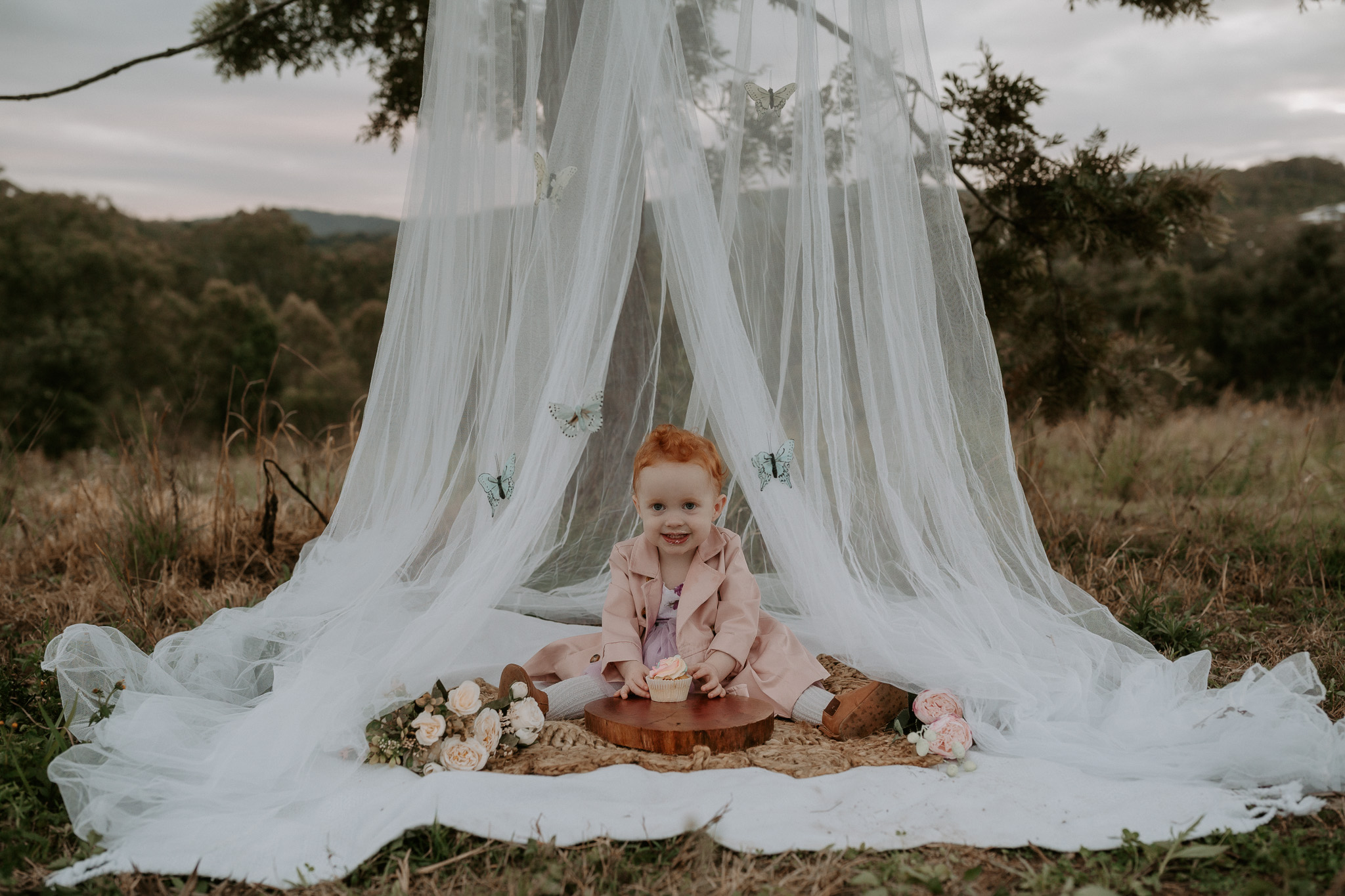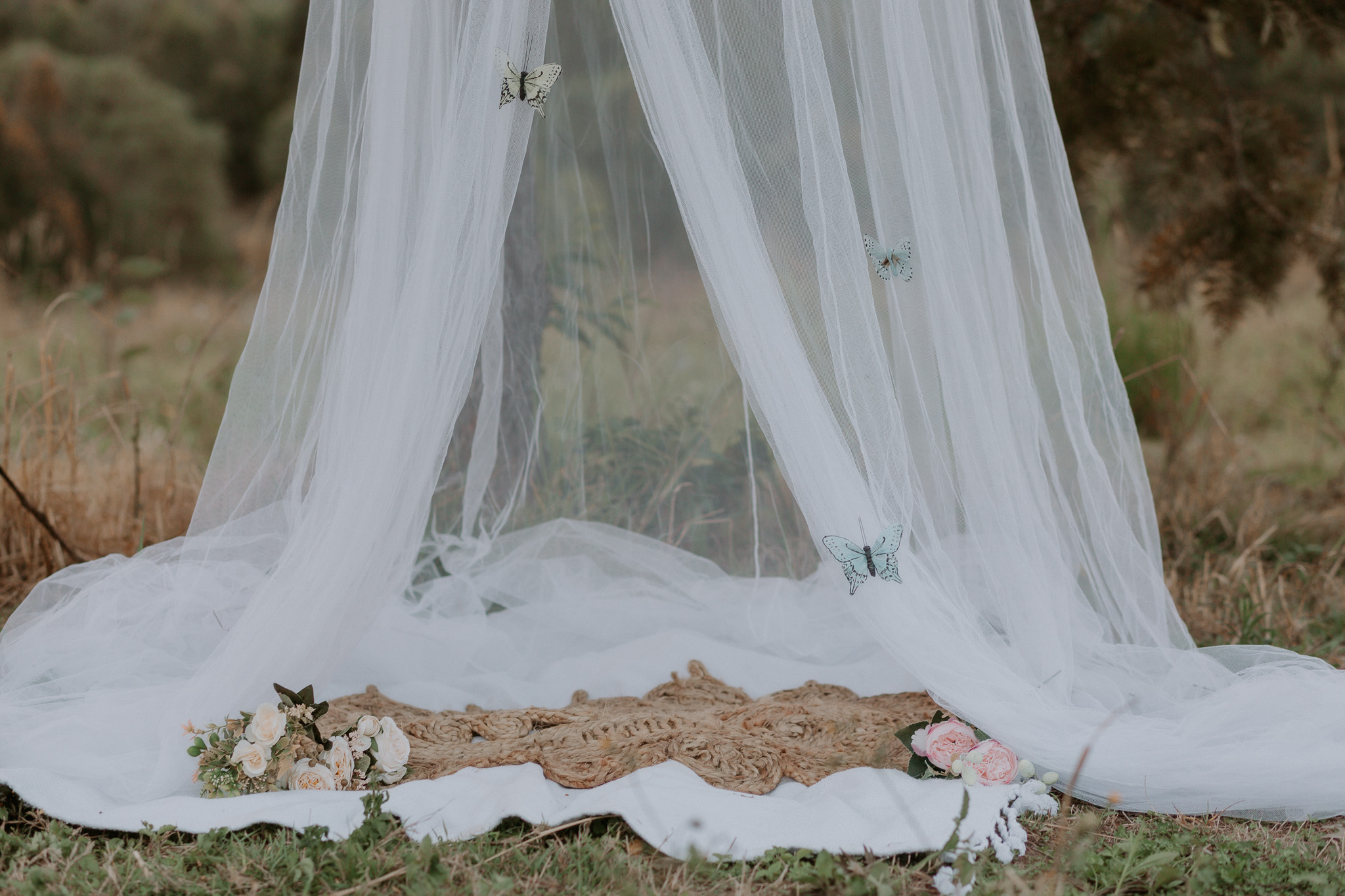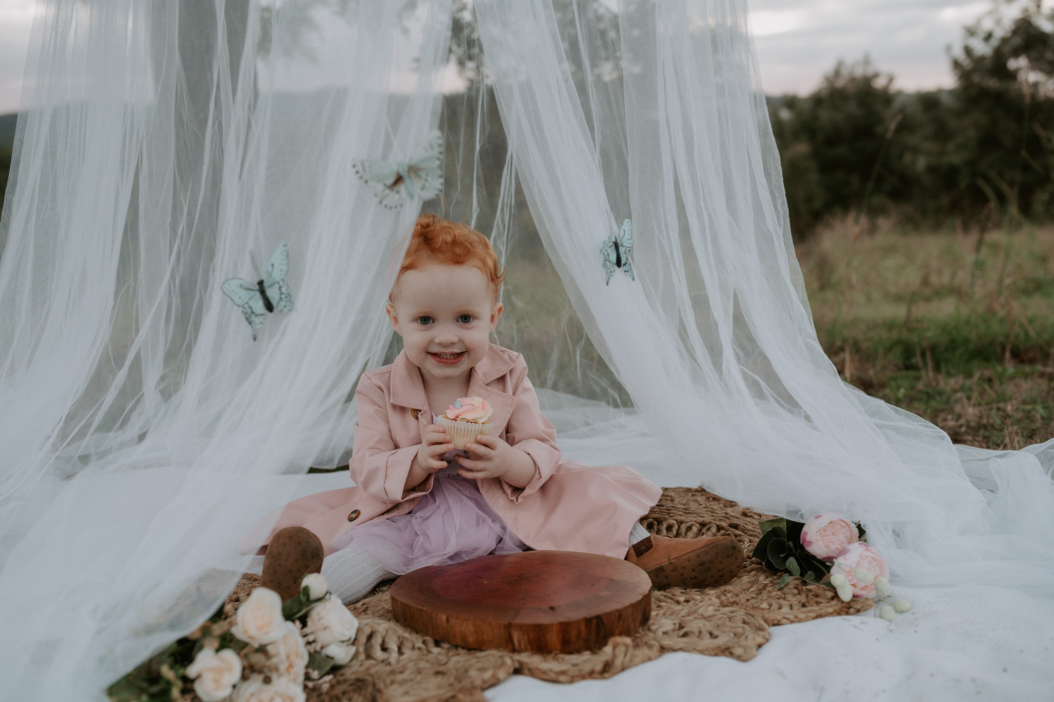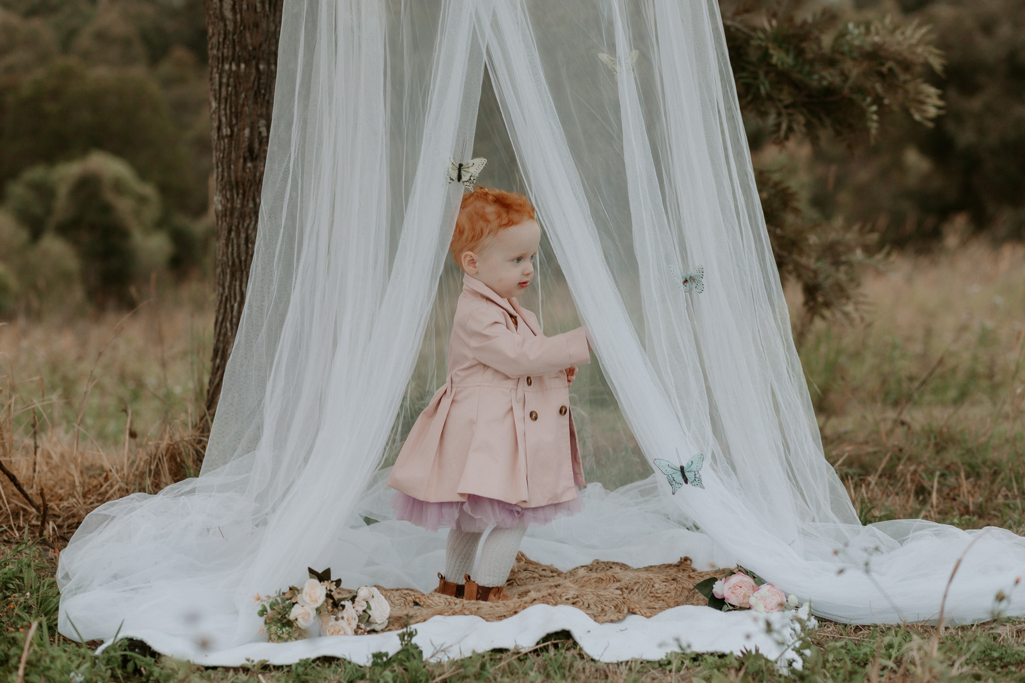 This session was done at one of my favourite locations – the Ormeau Field. I used a bed net, rug, some flowers, a little doorstep rug and some gently hung butterflies to decorate the set. My daughter loved the butterflies, but she also loved pulling them off. If I did this set up again, I’d likely hang them with fishing wire instead.