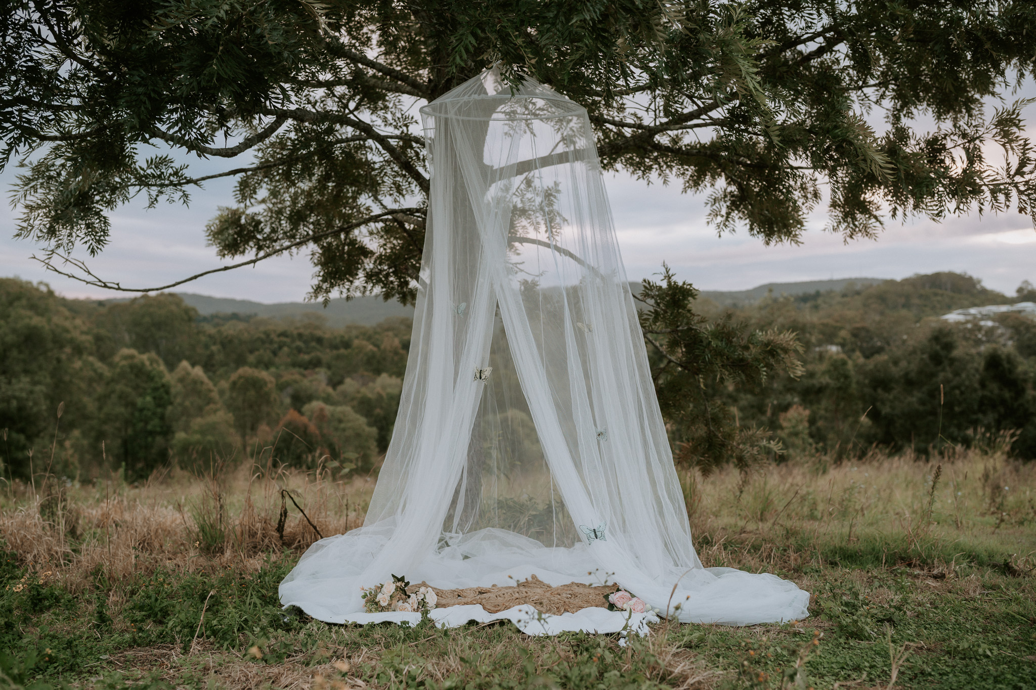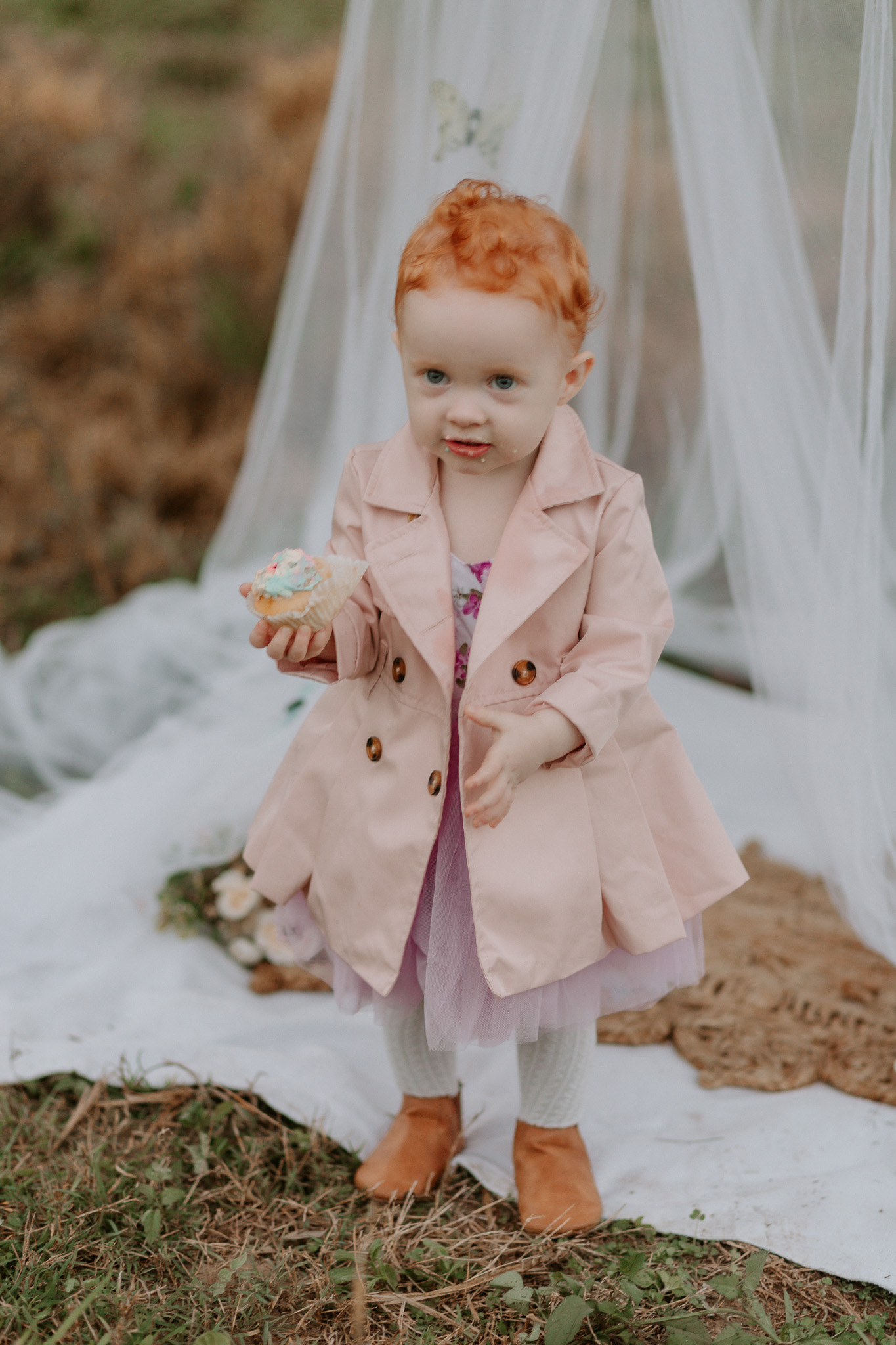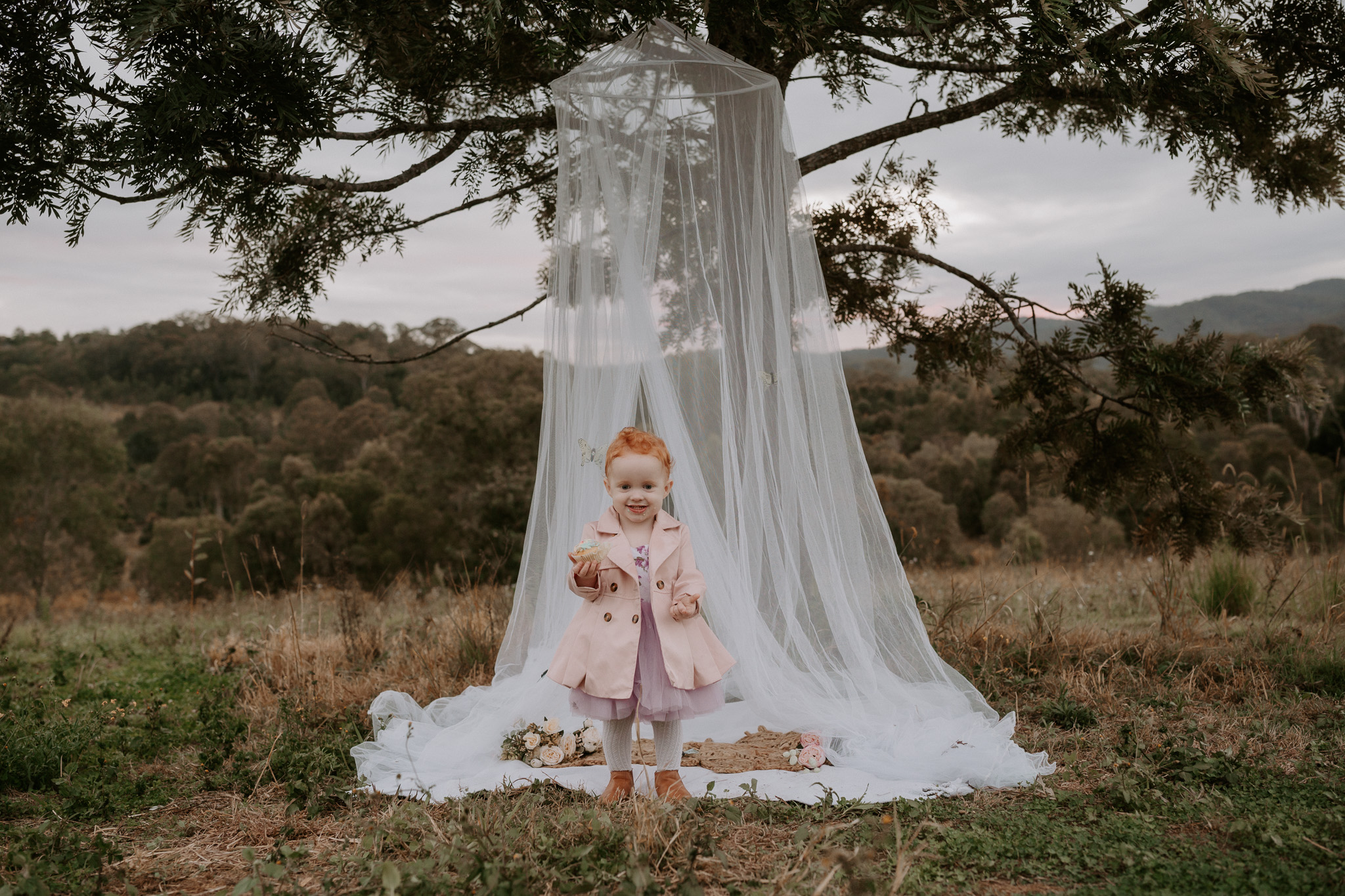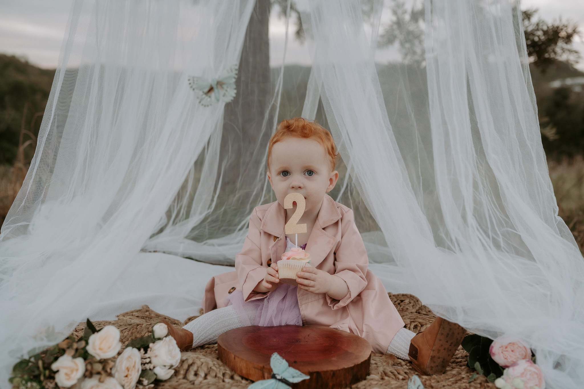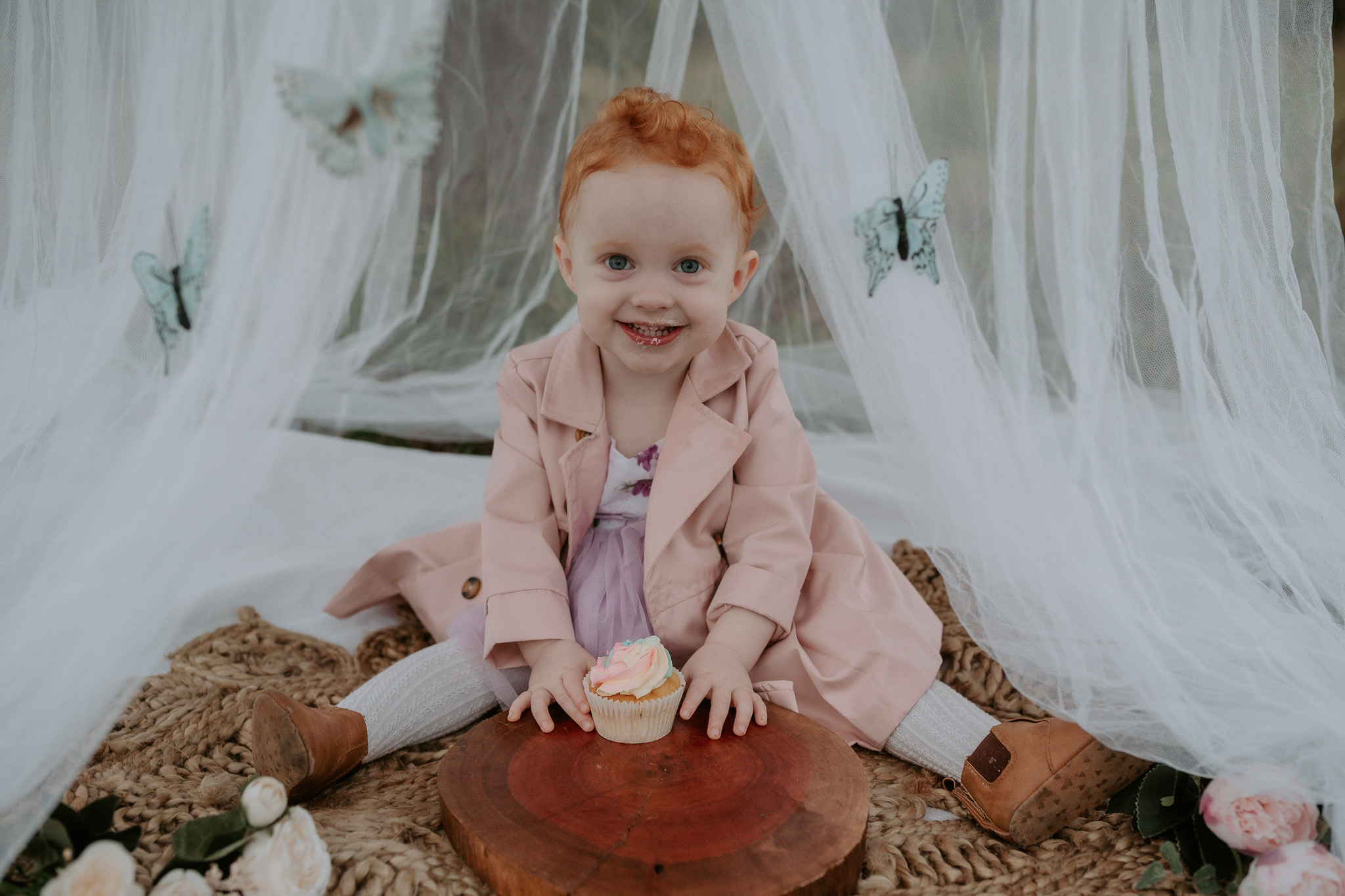This session was done at one of my favourite locations – the Ormeau Field. I used a bed net, rug, some flowers, a little doorstep rug and some gently hung butterflies to decorate the set. My daughter loved the butterflies, but she also loved pulling them off. If I did this set up again, I’d likely hang them with fishing wire instead.